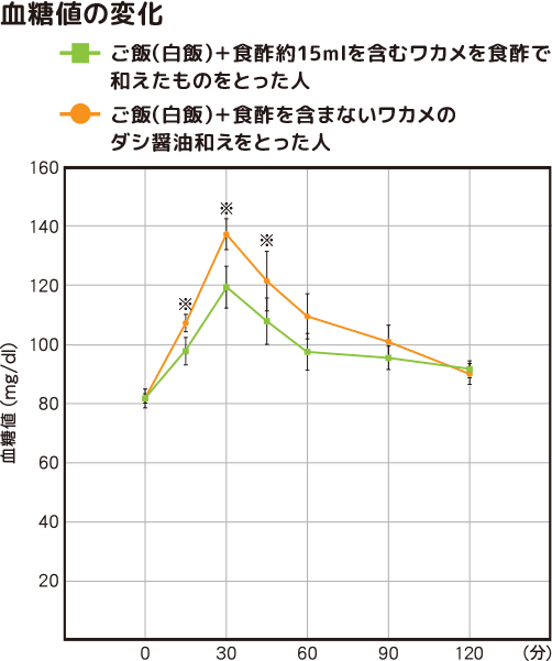 ![]()  - ※は、食酢を約15ml含むワカメの食酢和えをとった人は、食酢を含まないワカメのダシ醤油和えをとった人と比べ、有意に血糖値が低いことを示しています。